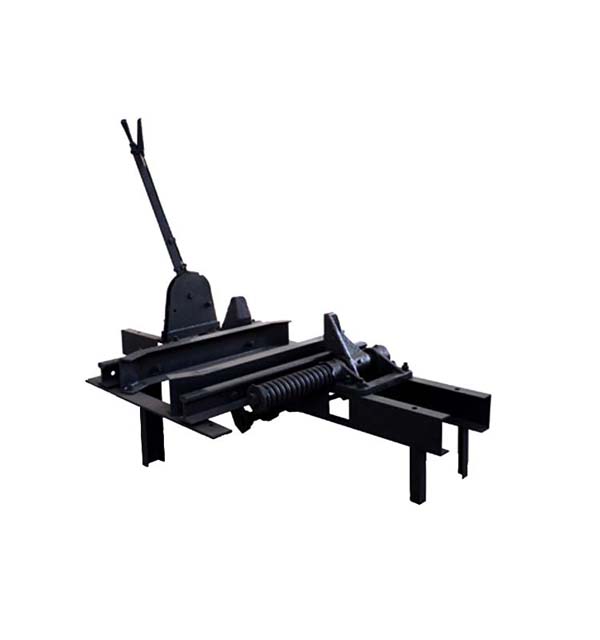 此阻车器为阻轮式阻车器,是矿井车场中将运行的矿车停止在某一个固定点的限位装置,主要由一对阻爪和弹簧缓冲装置等组成。阻爪打开时,矿车可自由通过;阻爪关闭时即阻挡住矿车车轮,是矿车停停止前进。阻车器可分为单式和复式两种。复式阻车器即两个联动的单式阻车器,相互动作闭锁,除停止矿车外,还起分解矿车的作用。